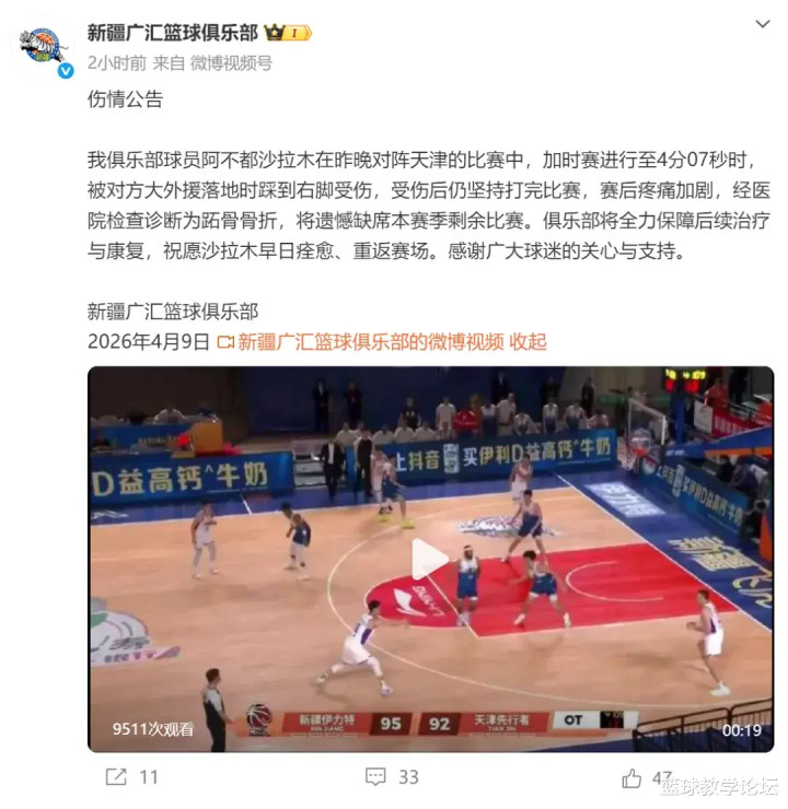 北京时间4月9日晚,CBA新疆男篮官方宣布:阿不都沙拉木在对阵天津的比赛中,被对方大外援落地时踩到右脚受伤,诊断为跖骨骨折,本赛季正式报销。本赛季CBA常规赛只有42轮,目前新疆男篮13胜23负,仅排联赛第15位。