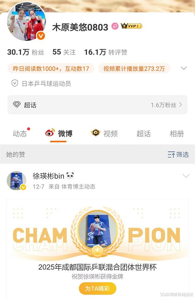更让人想不到的是,日本女队的木原美悠竟然在微博上点赞了徐瑛彬随队获得混团世界杯的消息,很多人扒出了两人曾被拍到逛街的照片。木原美悠是个毫不掩饰内心想法的人,她是陈梦的铁杆粉丝,全运会期间,她也全程祝贺偶像取得好成绩,并不在乎那些输给陈梦的队友们怎么想。综合来看,似乎徐瑛彬的这段跨国恋的推测并非空穴来风。