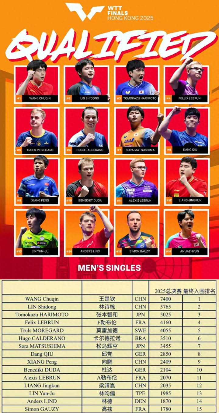 男单赛场,国乒参赛选手包括王楚钦、林诗栋、向鹏、梁靖崑,其中王楚钦以9925分位列世界第一,林诗栋以7156分排名第二。